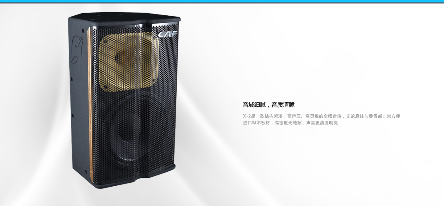 X-2 高频细腻 中频响应 介绍: X-2音箱选用顶级单元器件,使其拥有温暖、饱满的中低频响应,轻质、柔和的高频细腻感;适用于全声域扩声、高级卡拉OK包房、慢摇吧、多功能厅、高级酒店、流动演出、乐队扩声等