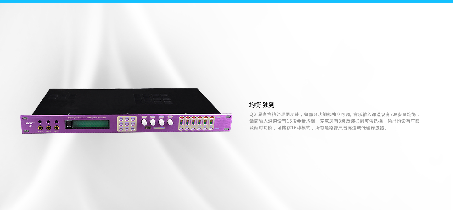 Q8 适用场所: 娱乐场所、单位活动中心 规格面积: 13~300㎡的场所 其他说明: 数位式前级,采用24Bit数据部线和32Bit DSP,具有音箱处理器功能,每部分功能都独立可调,音乐输入通道设有7段参量均衡,话筒输入通道设有15段参量均衡。