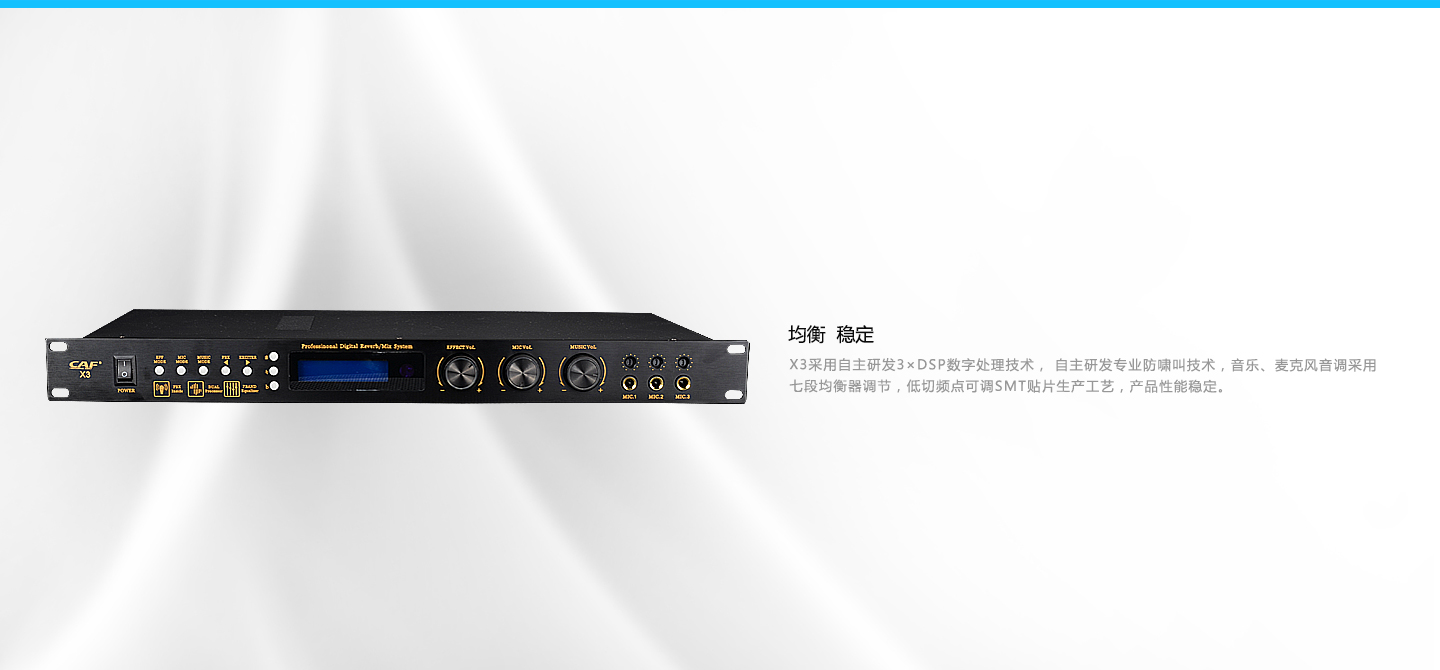 X3 适用场所: 娱乐场所、单位活动中心 规格面积: 13~300㎡的场所 其他说明: 自主研发3×DSP数字处理技术,数控模拟音频处理电路, 音乐、麦克风音调采用七段均衡器调节,低切频点可调, 自主研发专业防啸叫技术。