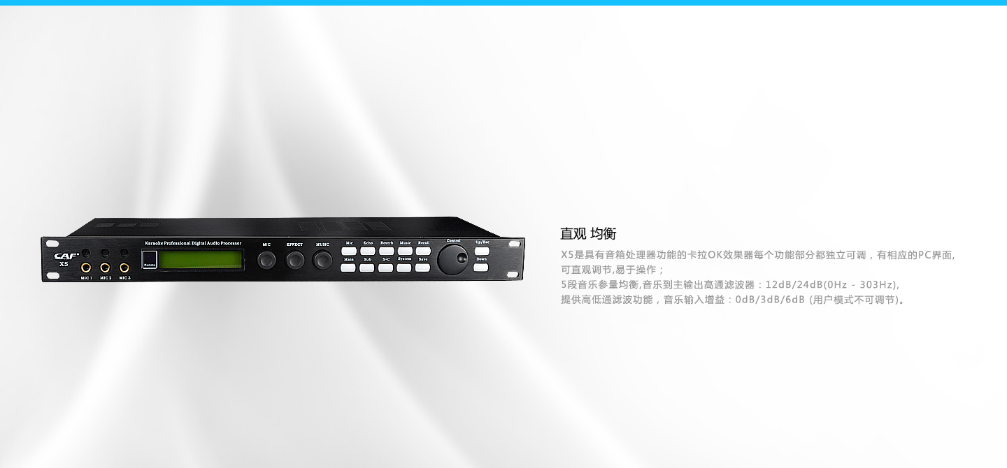 X5 适用场所: 娱乐场所、单位活动中心 规格面积: 13~300㎡的场所 其他说明: 具有音箱处理器功能的卡拉OK效果器, 每个功能部分都独立可调,有相应的PC界面,可直观调节,易于操作,5段音乐参量均衡,音乐到主输出高通滤波器:12dB/24dB(0Hz - 303Hz)。