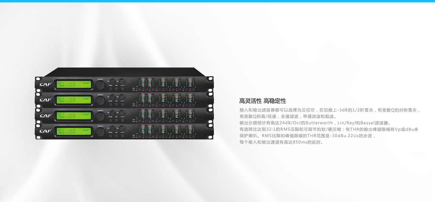 PA360Q 适用场所: 剧院演出,露天、室内大中小型文化演出 规格面积: 300㎡以上 其他说明: 3个输入电平:6个电平灯+1个削顶灯排列组成;6个输出灯:5个电平灯+1个削顶灯+1个限幅灯排列组成。3个模拟输入、1个立声体数字输入和6个模拟输出。每个输入有5段参数滤波器,每个输出有5段参数滤波器