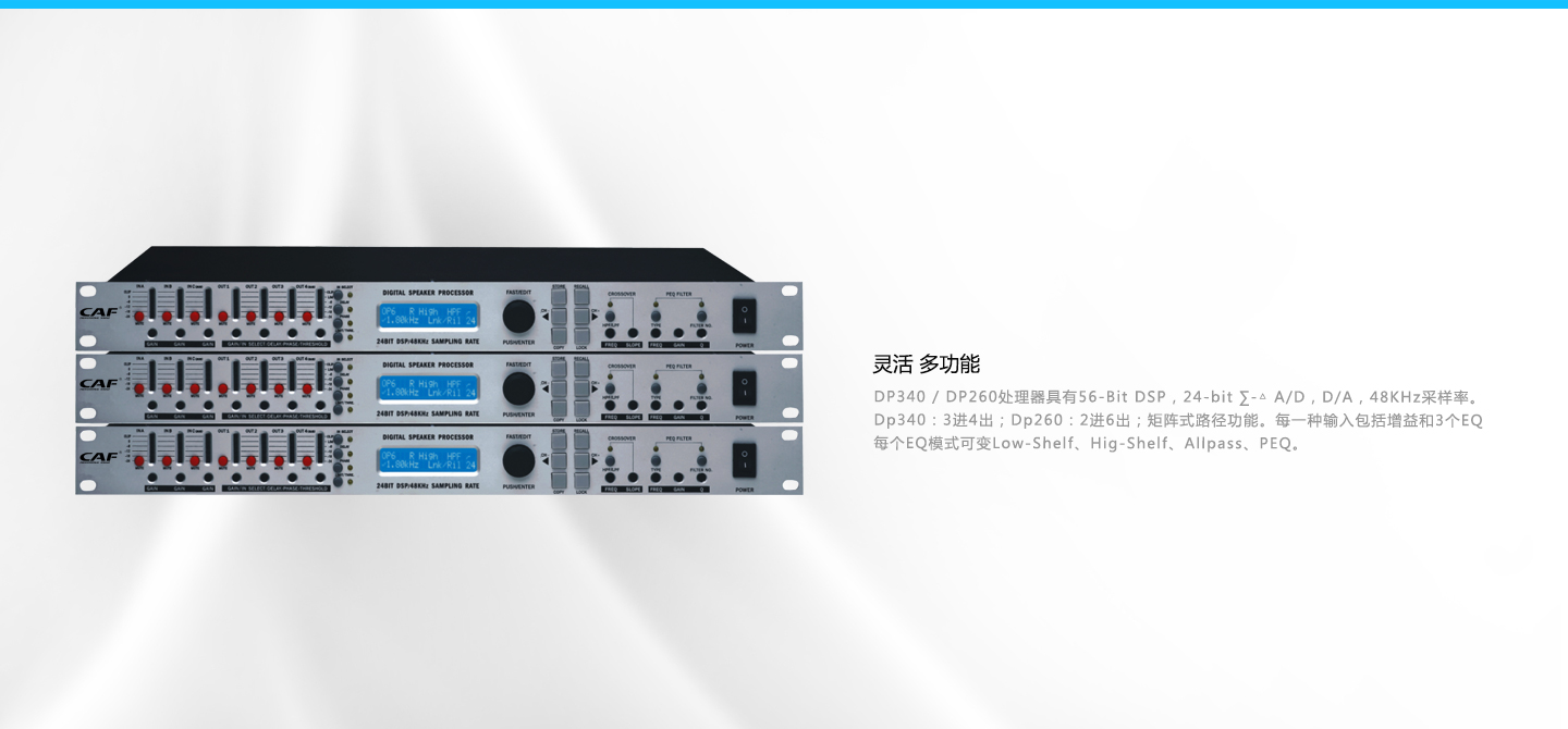 DP340 / DP260 适用场所: 剧院演出,露天、室内大中小型文化演出 规格面积: 300㎡以上 其他说明: 56-Bit DSP,24-bit ∑-△ A/D,D/A,48KHz采样率;Dp340:3进4出;Dp260:2进6出;矩阵式路径功能;每一种输入包括增益和3个EQ,每个EQ模式可变。